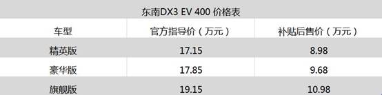 東南DX3 EV400正式上市 補(bǔ)貼前17.15-19.15萬元