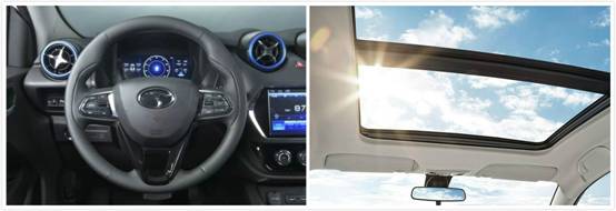 新車整體以黑色為主,邊緣輔以藍(lán)色元素點(diǎn)綴,增強(qiáng)其內(nèi)飾的辨識(shí)度,又不失時(shí)尚感。車頂上方配有全景天窗,座椅選擇了織布與真皮拼接的式樣,在易磨損的地方使用真皮材質(zhì),可謂是匠心獨(dú)運(yùn)。