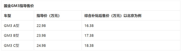 2018款國金GM3車型共包含3款車型,補(bǔ)貼前售價(jià)區(qū)間為22.98-24.98萬元,補(bǔ)貼方面,以北京為例該車可享受4.4萬元的國家補(bǔ)貼和2.2萬元的地區(qū)補(bǔ)貼,所以其最終補(bǔ)貼后售價(jià)為16.38-18.38萬元,詳細(xì)售價(jià)請見下表: