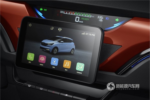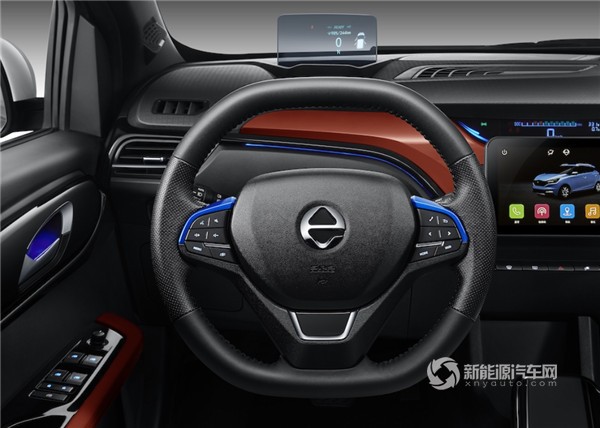 易至EV3整體采用了黑紅雙色的搭配,給人一種運動的風格。車輛內部采用了多處藍色元素點綴,以顯示其新能源車身份。