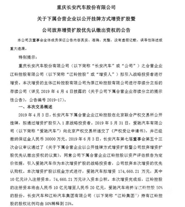 雙方簽署的增資協(xié)議表明,此次增資擴股以現(xiàn)金方式進行,愛馳汽車擬增資17.47億元,其中10億元計入注冊資本,7.47億元計入資本公積。本次增資完成后,江鈴控股的注冊資本由10億元增至20億元,愛馳汽車將持有江鈴控股50%的股份,成為大股東;而長安汽車和江鈴汽車集團有限公司持有江鈴控股的股權比例均由50%稀釋到25%。同時,愛馳汽車也因此獲得造車資質。