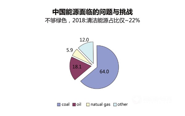 這是一個統(tǒng)計的餅狀圖:2018年清潔能源的占比大概是保持在1/5的水平,這是2018年電力工業(yè)的統(tǒng)計資料,從資料當中看,我們在清潔能源方面其實我們已經(jīng)取得了巨大的進步,包括我們的核電已經(jīng)增長接近20%,風電增長超過20%,太陽能已經(jīng)是50%的增長,但是即使在這種情況下,我們所有的清潔能源占比其實也只有20%多一點點。
