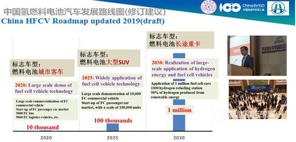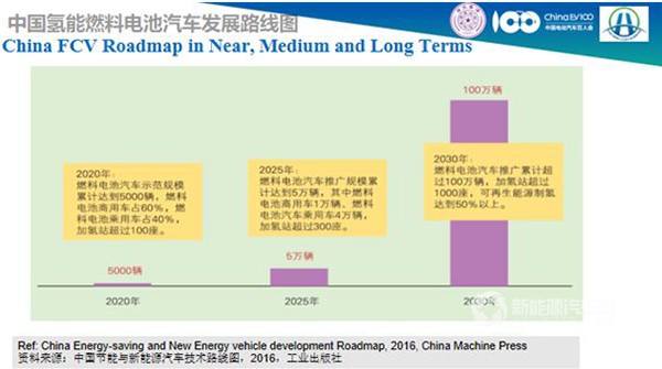 王賀武的解釋是路線圖分為近、中、遠(yuǎn)三期:近期到2020年時(shí),中國將運(yùn)行5,000輛FCV(實(shí)際已經(jīng)超過6000輛),并在高效制氫、儲存、運(yùn)輸、分配以及加氫站等技術(shù)上有突破;中期目標(biāo)是在2025年時(shí),實(shí)現(xiàn)10000輛商用車和40000輛乘用車的運(yùn)行;而遠(yuǎn)期目標(biāo)是到2030年時(shí),完成100萬輛FCV的運(yùn)行,其氫氣來源50%將來自于可再生能源制氫,此外還將運(yùn)營超過1000個(gè)加氫站,以保障氫能燃料電池汽車的正常行駛。