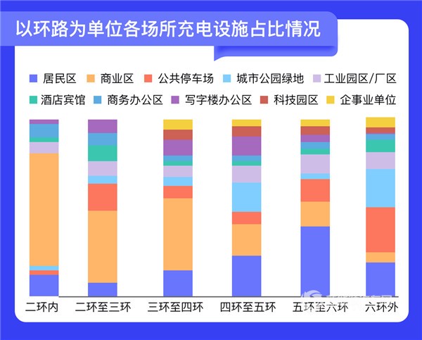 另外,e充網(wǎng)的數(shù)據(jù)中也能夠看出,充電設(shè)施主要集中在五環(huán)內(nèi)的商業(yè)區(qū)和居民區(qū),尤其是二環(huán)內(nèi),主要是因?yàn)槎h(huán)內(nèi)多為老舊建筑,僅有商業(yè)區(qū)能夠進(jìn)行充電設(shè)施的加裝。而在二環(huán)到五環(huán)中間,充電設(shè)施在商業(yè)區(qū)逐漸減少,在居民區(qū)逐漸增多,這也是城市規(guī)劃的商業(yè)和居民較為吻合,尤其是四環(huán)至五環(huán)之間,居民區(qū)較多。