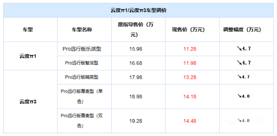 云度π1/π3官方調(diào)價(jià) 降幅最高達(dá)4.8萬