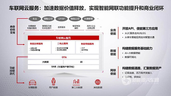 車聯(lián)網(wǎng)云服務(wù),聚焦在網(wǎng)聯(lián)使能、數(shù)據(jù)使能和業(yè)務(wù)使能三方面,幫助構(gòu)建一個(gè)人、車、環(huán)境互聯(lián)的世界。