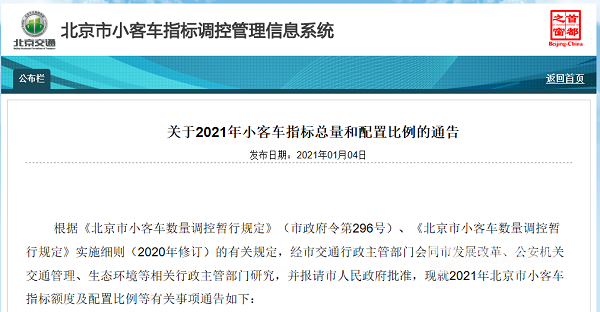 2021年1月4日,北京市小客車指標(biāo)調(diào)控管理辦公室公布了《關(guān)于2021年小客車指標(biāo)總量和配置比例的通告》。《通告》指出,2021年小客車指標(biāo)年度配額為10萬個(gè),其中有6成,即6萬個(gè)指標(biāo)為新能源,剩下的為普通指標(biāo)。