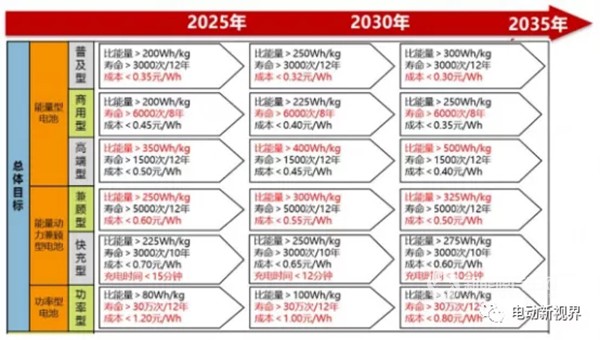 4)在動力電池詳細參數(shù)設置上,分階段做了詳細劃分,如對比能量密度、電池壽命、成本等參數(shù)設置最低門檻及提升方向。
