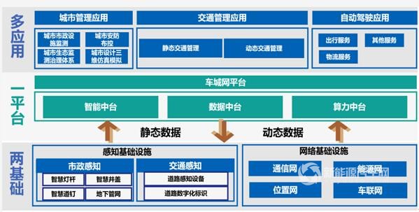 “一平臺”指的是車城網(wǎng)平臺。車城網(wǎng)平臺以城市信息模型(CIM)平臺為基礎(chǔ),匯聚城市道路、交通、汽車、公共設(shè)施、市政設(shè)施、地理信息等動態(tài)和靜態(tài)數(shù)據(jù),建設(shè)開源開放、支撐多類應(yīng)用。