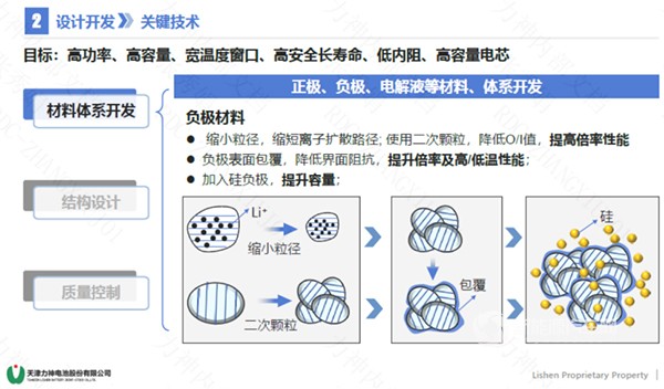 首先是正極材料,在正極材料方面,提升容量方面主要是從鎳含量的提升去提升容量,在功率性能方面主要是縮短鋰離子傳輸路徑,我們從最初的比較大球的高鎳三元,比如原來(lái)是10微米左右,可能會(huì)到5微米,當(dāng)然這個(gè)是根據(jù)電池的需求設(shè)計(jì)的,如果需要的倍率更高可能這個(gè)材料會(huì)有一個(gè)真空的設(shè)計(jì),會(huì)進(jìn)一步縮短鋰離子傳輸路徑。