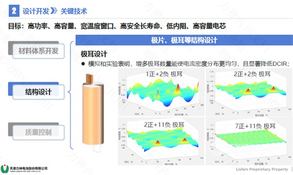 下面是極耳設(shè)計(jì),當(dāng)時(shí)也做了很多模擬,我們發(fā)現(xiàn)極耳增多會(huì)使電流密度分布更加均勻,而且會(huì)顯著降低DCR,這是我們當(dāng)時(shí)做的一些實(shí)驗(yàn)輔助這個(gè)模擬。而且能夠特別明顯提升大倍率性能,這樣我們有一個(gè)80A脈沖性能,可以發(fā)現(xiàn)極耳越多脈沖性能提升越明顯。