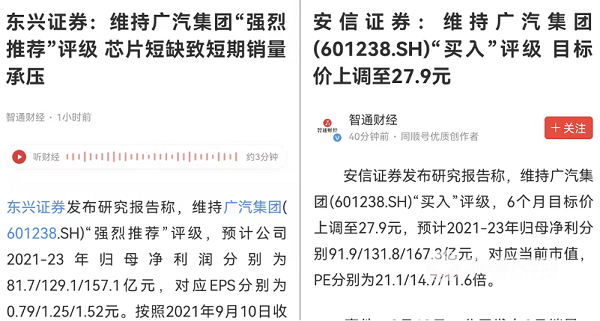 在廣汽埃安混改利好因素影響下,資本市場(chǎng)重新評(píng)估廣汽。多家證券公司持續(xù)看好廣汽的發(fā)展空間,對(duì)廣汽集團(tuán)作出“強(qiáng)烈推薦評(píng)級(jí)”,東興證券研究報(bào)告稱,隨著廣汽集團(tuán)未來幾年歸母凈利潤(rùn)的上漲,按照2021年9月10日收盤價(jià),對(duì)應(yīng)2021-23年的PE值分別為24/15/12倍。安信證券的研究報(bào)告將廣汽6個(gè)月的目標(biāo)價(jià),上調(diào)至27.9元。