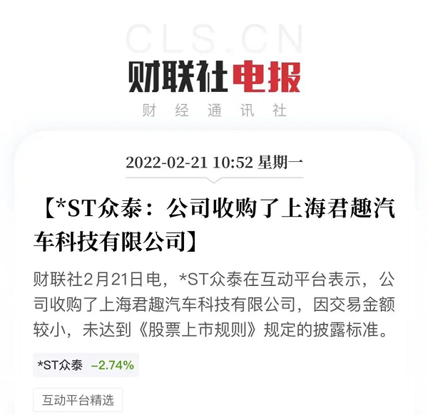 借殼上市? 眾泰收購(gòu)上海君趣科技公司