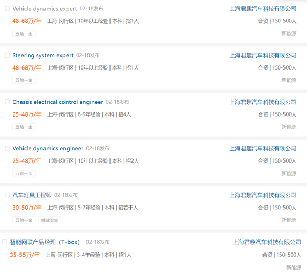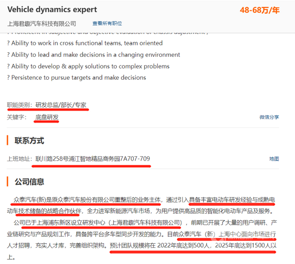 另外,我們通過(guò)招聘網(wǎng)站可以發(fā)現(xiàn),上海君趣汽車(chē)科技有限公司正在招聘多個(gè)崗位,從年薪二十萬(wàn)到百萬(wàn)不等,而公司介紹里面,則全是眾泰汽車(chē)的公司介紹,并表示在2022年團(tuán)隊(duì)規(guī)模達(dá)到500人,2025年達(dá)到1500人。而招聘負(fù)責(zé)人表示,君趣汽車(chē)是眾泰旗下的新能源,是獨(dú)立的一個(gè)家公司,或許這個(gè)公司將以博郡汽車(chē)的產(chǎn)品正式進(jìn)入市場(chǎng)。