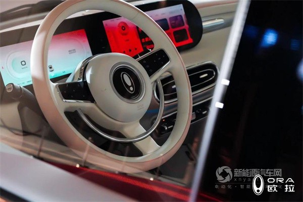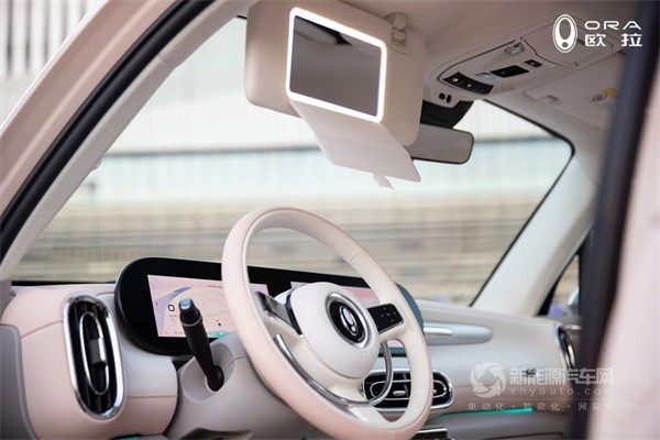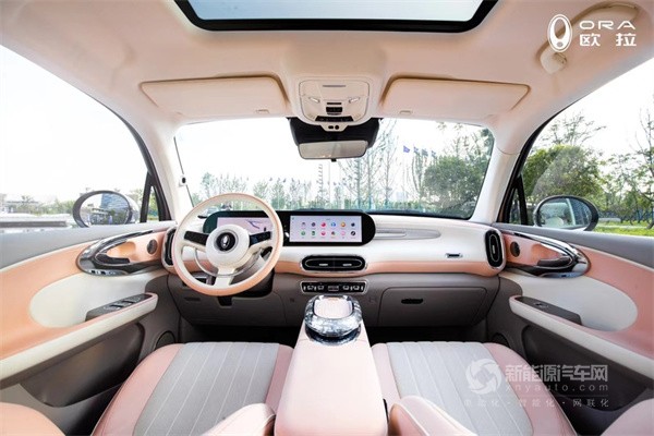車內(nèi)與歐拉好貓風(fēng)格很像,依舊走得粉嫩少女風(fēng)。圓圓的復(fù)古方向盤(pán),圓形的空調(diào)出風(fēng)口造型,關(guān)鍵是兩側(cè)門(mén)板、以及副駕駛的位置,還有專屬圖案的刺繡,非常精致。配置方面,全系標(biāo)配10.25英寸全液晶儀表、12.3英寸中控屏。值得一提的是,就連中控屏的系統(tǒng)UI,也是專為女性用戶打造。另外,芭蕾貓的設(shè)計(jì)師把雙聯(lián)屏的邊框和空調(diào)出風(fēng)口都采用了圓弧形設(shè)計(jì),整體讓車內(nèi)看起來(lái)更加的和諧。