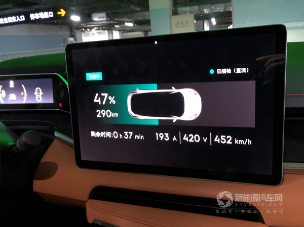極氪001車內(nèi)的懸浮觸控屏,顯示車輛充電狀態(tài)。開邁斯充電功率充電電壓420V ,充電電流193A ,輸出功率120KW。