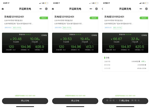 下圖分別是極氪充電至8分鐘、15分鐘、25分鐘,手機微信公眾號開邁斯充電顯示的車輛充電狀態(tài)及消耗金額。