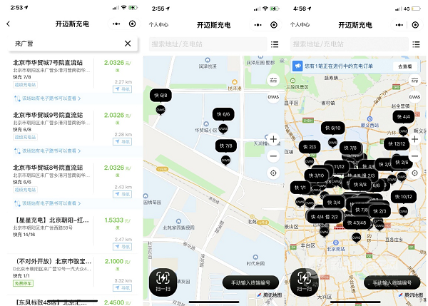 此外開邁斯網(wǎng)點布局廣,多在北京購物商場及生活區(qū)內(nèi),在開邁斯充電微信公眾號查詢,可顯示北京市內(nèi)的所有已布局開邁斯充電的網(wǎng)點,同時還顯示充電樁種類及數(shù)量。