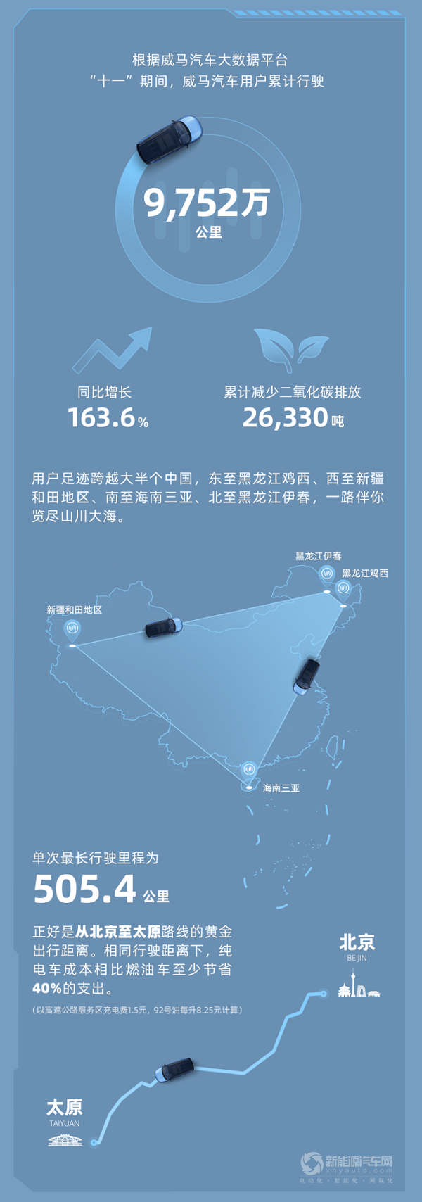 “十一”期間,威馬用戶累計行駛里程超9,752萬公里,威馬車主的足跡跨越大半個中國,東至黑龍江雞西、西至新疆和田地區(qū)、南至海南三亞、北至黑龍江伊春。其中,用戶單車單次最長行駛里程為505.4公里,正好是從北京至太原路線的黃金出游距離。假設(shè)按某日系品牌燃油車計算,行駛505.4公里需花費(fèi)252.7元,而相同行駛距離,純電車僅需支付151.62元,開純電車成本相比燃油車至少節(jié)省40%的支出。(以高速公路服務(wù)區(qū)充電費(fèi)1.5元,重慶92號油每升8.25元計算)