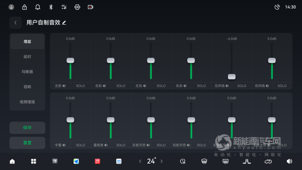 新增音效大師功能,音樂愛好者們可以根據(jù)個人習慣,調(diào)整每個通道的增益、延時、均衡器、混響和低頻增強5個維度。其中,官方預(yù)置模板提供8套專業(yè)調(diào)音師調(diào)制的預(yù)置音效,用戶也可以創(chuàng)建個性化音效,并分享給其他車友。