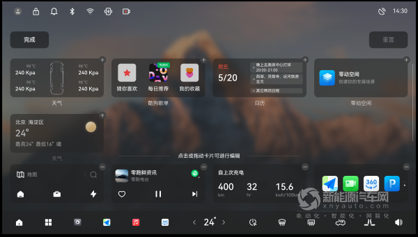 Widget在現(xiàn)有4張卡片的基礎(chǔ)上,新增了天氣、日歷、胎壓顯示、零動空間、酷狗音樂5個內(nèi)容卡片;用戶可以通過長按任意一張Widget卡片,進入自定義編輯狀態(tài),添加、刪除或移動卡片,讓座艙桌面更符合個人的使用習慣。