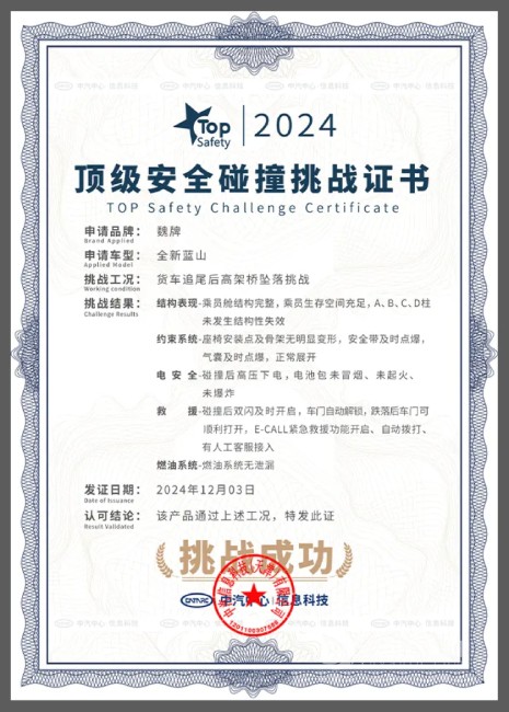 最終,全新藍(lán)山憑借硬核實(shí)力順利完成碰撞挑戰(zhàn),為家庭鑄造全方位安全屏障,榮獲中汽研頒發(fā)的“頂級安全碰撞挑戰(zhàn)證書”!