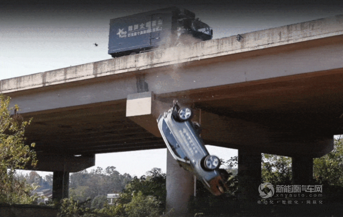 還原交通生活中可能遇到的高危場景,全新藍(lán)山開啟NOA智駕系統(tǒng)正常行駛,遇到行人橫穿車輛自動(dòng)緊急剎停被后方失控大貨車追尾,墜落高架橋。