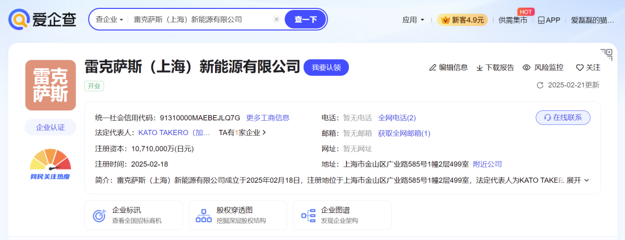 雷克薩斯(上海)新能源有限公司 圖源:愛(ài)企查