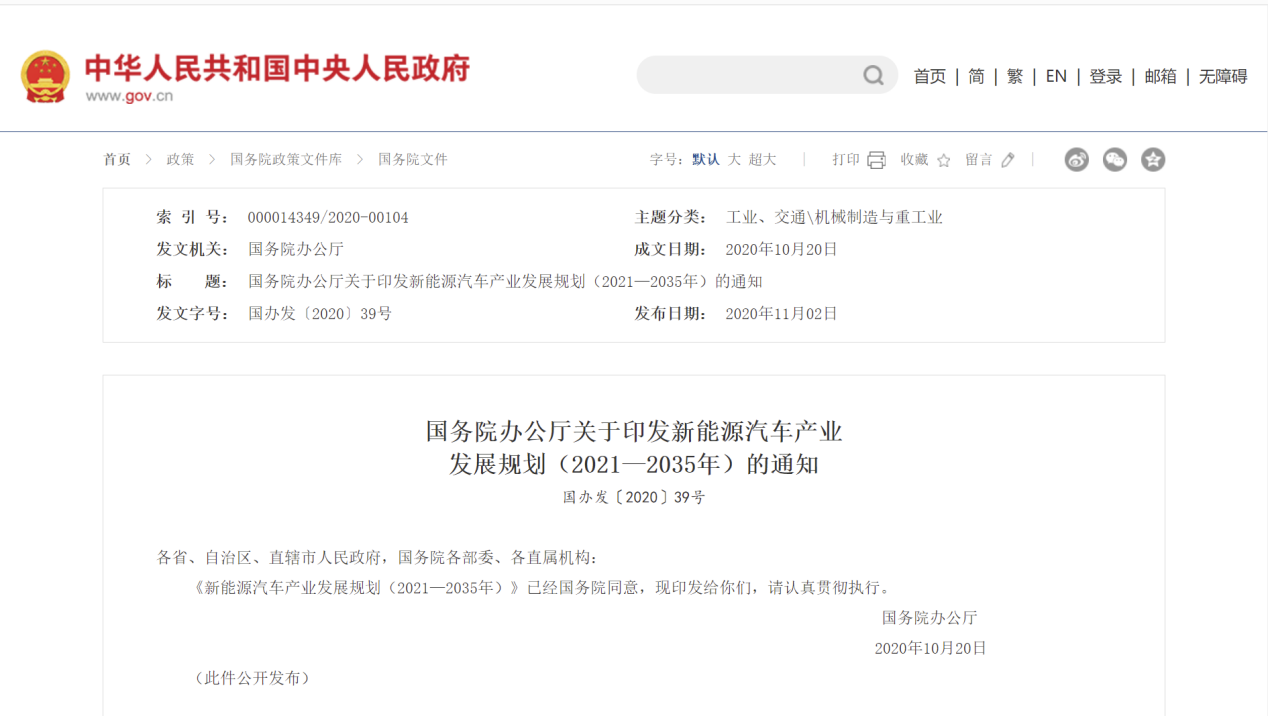 國(guó)務(wù)院辦公廳關(guān)于印發(fā)新能源汽車(chē)產(chǎn)業(yè)發(fā)展規(guī)劃(2021—2035年)的通知 圖源: 國(guó)務(wù)院辦公廳