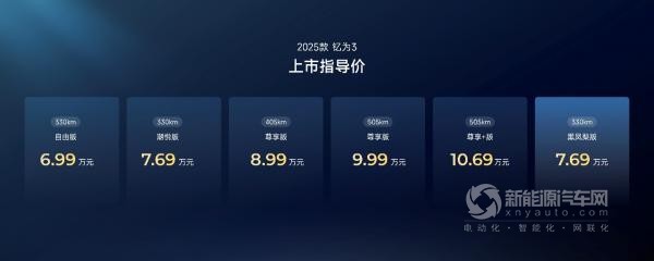 價(jià)格方面,2025款釔為3以6.99-10.69萬元的指導(dǎo)價(jià)覆蓋6-10萬元市場,疊加農(nóng)村戶籍購買12萬元以下新能源車直接補(bǔ)貼車價(jià)15%(最高2萬元)、購買續(xù)航里程超過400公里的純電動(dòng)車可獲得最高2萬元補(bǔ)貼等政策后進(jìn)一步降低了購車門檻,滿足下沉市場對(duì)高性價(jià)比車型的需求。