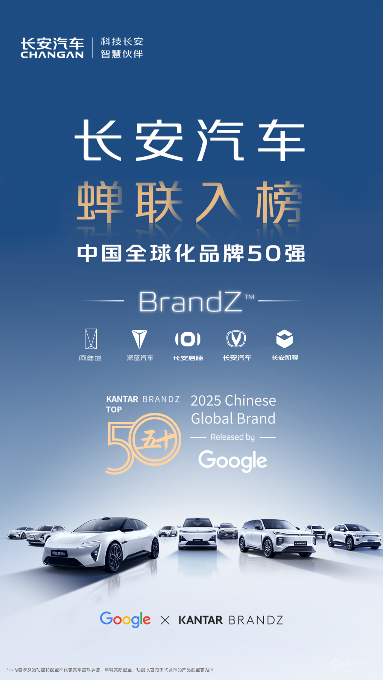 6月18日,谷歌(Google)聯(lián)合全球知名品牌數(shù)據(jù)與分析公司凱度(KANTAR)發(fā)布“2025BrandZ中國全球化品牌50強(qiáng)”榜單,長安汽車成功上榜,同時(shí)今年也是長安汽車連續(xù)兩年獲此殊榮,全球化品牌勢能持續(xù)向上。